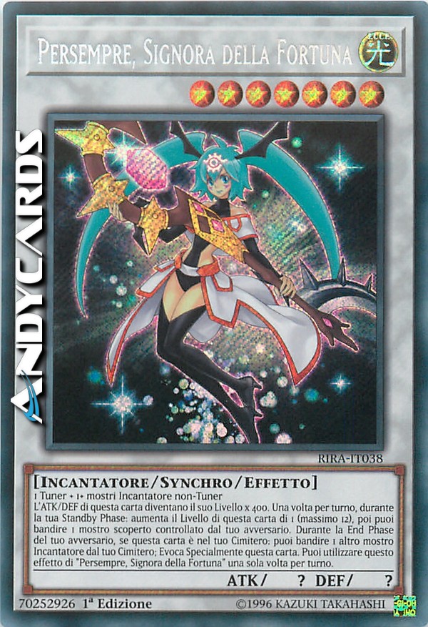 L'ATK/DEF di questa carta diventano il suo Livello x 400. Una volta per turno, durante la tua Standby Phase: aumenta il Livello di questa carta di 1 (massimo 12), poi puoi bandire 1 mostro scoperto controllato dal tuo avversario. Durante la End Phase del tuo avversario, se questa carta è nel tuo Cimitero: puoi bandire 1 altro mostro Incantatore dal tuo Cimitero; Evoca Specialmente questa carta. Puoi utilizzare questo effetto di "Persempre, Signora della Fortuna" una sola volta per turno.
