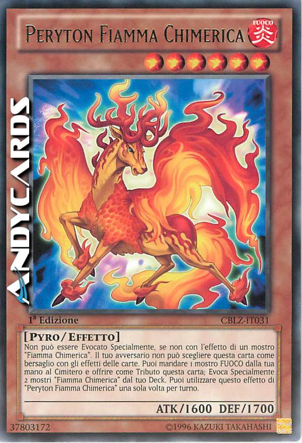 Non può essere Evocata Specialmente, se non con l'effetto di un mostro "Fiamma Chimerica". Il tuo avversario non può scegliere questa carta come bersaglio con gli effetti delle carte. Puoi mandare 1 mostro FUOCO dalla tua mano al Cimitero e offrire come Tributo questa carta; Evoca Specialmente 2 mostri "Fiamma Chimerica" dal tuo Deck. Puoi utilizzare questo effetto di "Peryton Fiamma Chimerica" una sola volta per turno.