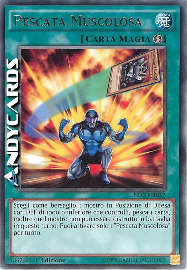 Scegli come bersaglio 1 mostro in Posizione di Difesa con DEF di 1000 o inferiore che controlli; pesca 1 carta, inoltre quel mostro non può essere distrutto in battaglia in questo turno. Puoi attivare solo 1 "Pescata Muscolosa" per turno.