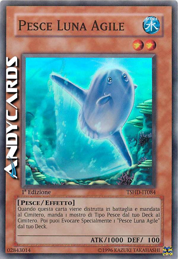 Quando questa carta viene distrutta in battaglia e mandata al Cimitero, manda 1 mostro di Tipo Pesce dal tuo Deck al Cimitero. Poi puoi Evocare Specialmente 1 "Pesce Luna Agile" dal tuo Deck.