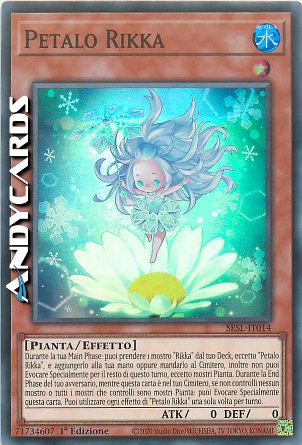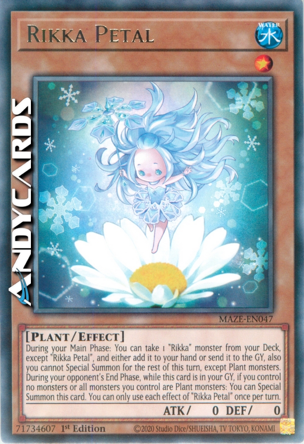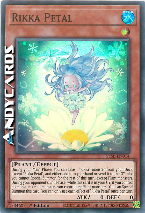 Durante la tua Main Phase: puoi prendere 1 mostro "Rikka" dal tuo Deck, eccetto "Petalo Rikka", e aggiungerlo alla tua mano oppure mandarlo al Cimitero, inoltre non puoi Evocare Specialmente per il resto di questo turno, eccetto mostri Pianta. Durante la End Phase del tuo avversario, mentre questa carta è nel tuo Cimitero, se non controlli nessun mostro o tutti i mostri che controlli sono mostri Pianta: puoi Evocare Specialmente questa carta. Puoi utilizzare ogni effetto di "Petalo Rikka" una sola volta per turno.
