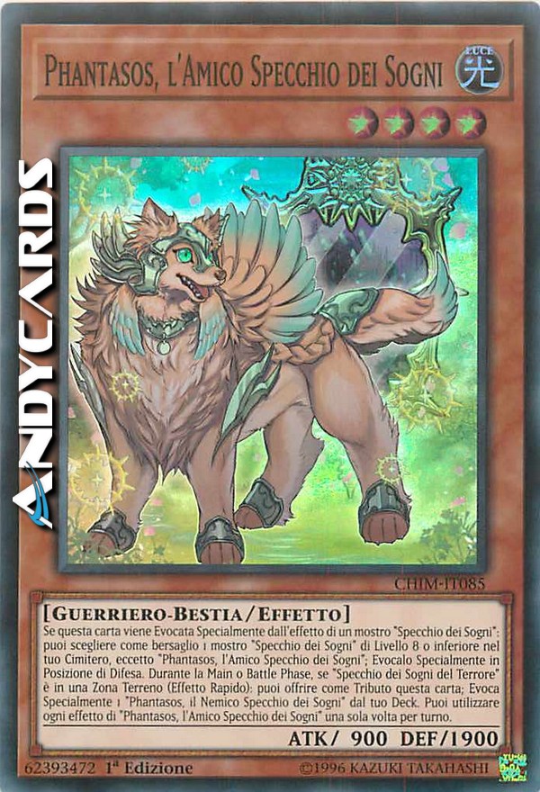Se questa carta viene Evocata Specialmente dall'effetto di un mostro "Specchio dei Sogni": puoi scegliere come bersaglio 1 mostro "Specchio dei Sogni" di Livello 8 o inferiore nel tuo Cimitero, eccetto "Phantasos, l'Amico Specchio dei Sogni"; Evocalo Specialmente in Posizione di Difesa. Durante la Main o Battle Phase, se "Specchio dei Sogni del Terrore" è in una Zona Terreno (Effetto Rapido): puoi offrire come Tributo questa carta; Evoca Specialmente 1 "Phantasos, il Nemico Specchio dei Sogni" dal tuo Deck. Puoi utilizzare ogni effetto di "Phantasos, l'Amico Specchio dei Sogni" una sola volta per turno.