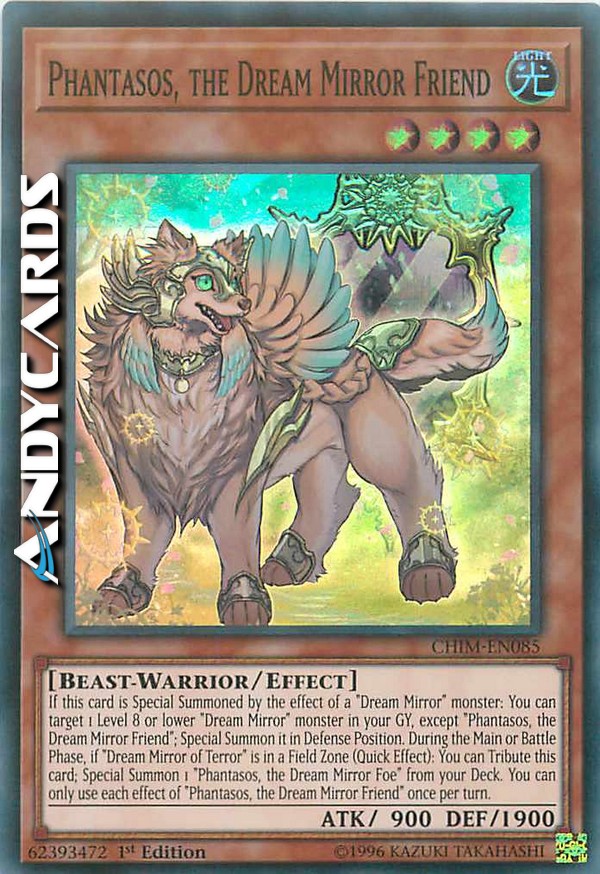 If this card is Special Summoned by the effect of a "Dream Mirror" monster: You can target 1 Level 8 or lower "Dream Mirror" monster in your GY, except "Phantasos, the Dream Mirror Friend"; Special Summon it in Defense Position. During the Main or Battle Phase, if "Dream Mirror of Terror" is in a Field Zone (Quick Effect): You can Tribute this card; Special Summon 1 "Phantasos, the Dream Mirror Foe" from your Deck. You can only use each effect of "Phantasos, the Dream Mirror Friend" once per turn.