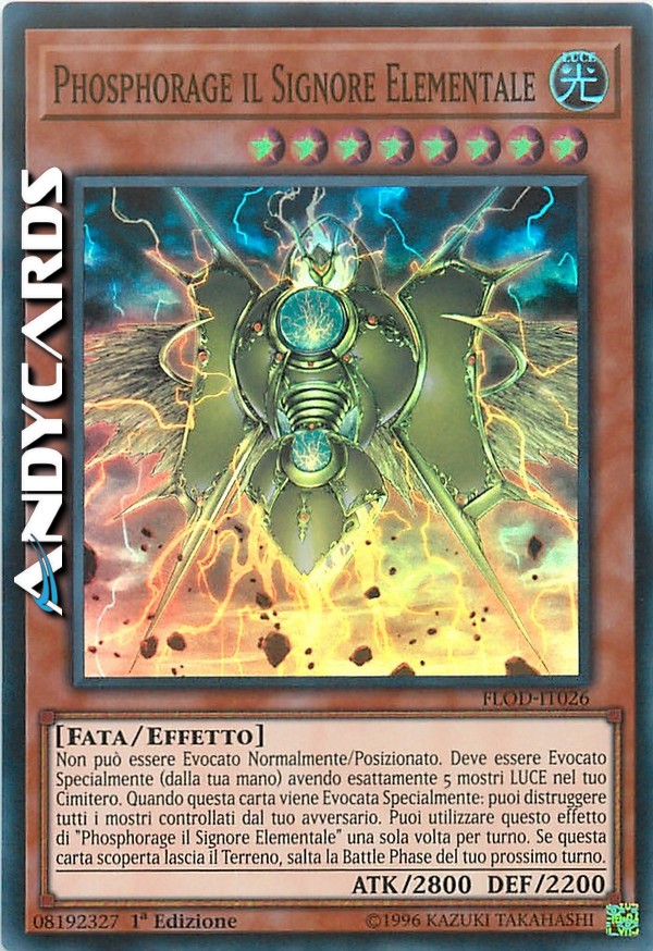Non può essere Evocato Normalmente/Posizionato. Deve essere Evocato Specialmente (dalla tua mano) avendo esattamente 5 mostri LUCE nel tuo Cimitero. Quando questa carta viene Evocata Specialmente: puoi distruggere tutti i mostri controllati dal tuo avversario. Puoi utilizzare questo effetto di "Phosphorage il Signore Elementale" una sola volta per turno. Se questa carta scoperta lascia il Terreno, salta la Battle Phase del tuo prossimo turno.