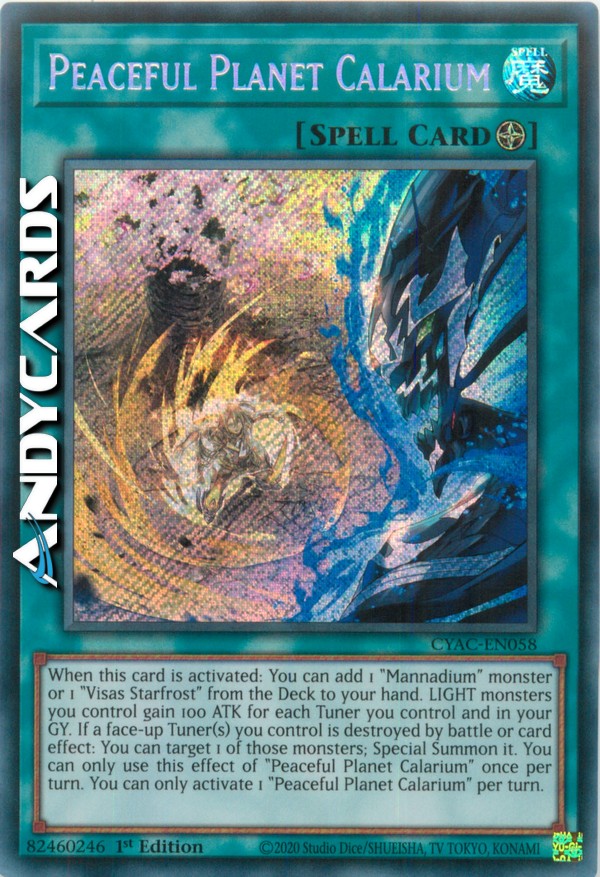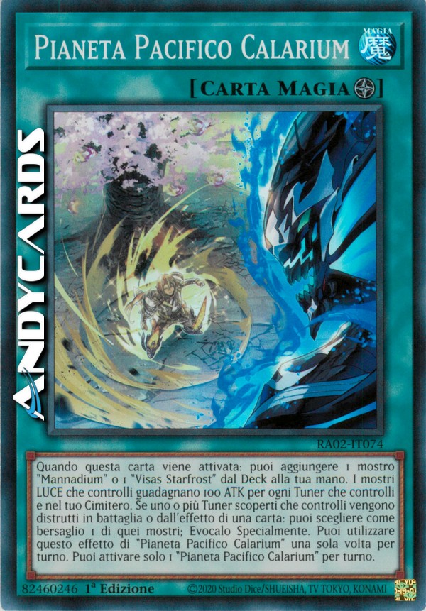 Quando questa carta viene attivata: puoi aggiungere 1 mostro "Mannadium" o 1 "Visas Starfrost" dal Deck alla tua mano. I mostri LUCE che controlli guadagnano 100 ATK per ogni Tuner che controlli e nel tuo Cimitero. Se uno o più Tuner scoperti che controlli vengono distrutti in battaglia o dall'effetto di una carta: puoi scegliere come bersaglio 1 di quei mostri; Evocalo Specialmente. Puoi utilizzare questo effetto di "Pianeta Pacifico Calarium" una sola volta per turno. Puoi attivare solo 1 "Pianeta Pacifico Calarium" per turno.