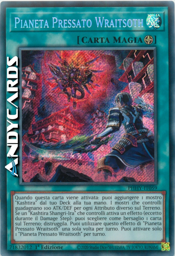 Quando questa carta viene attivata: puoi aggiungere 1 mostro "Kashtira" dal tuo Deck alla tua mano. I mostri che controlli guadagnano 100 ATK/DEF per ogni Attributo diverso sul Terreno. Se un "Kashtira Shangri-Ira" che controlli attiva un effetto (eccetto durante il Damage Step): puoi scegliere come bersaglio 1 carta sul Terreno; distruggila. Puoi utilizzare questo effetto di "Pianeta Pressato Wraitsoth" una sola volta per turno. Puoi attivare solo 1 "Pianeta Pressato Wraitsoth" per turno.