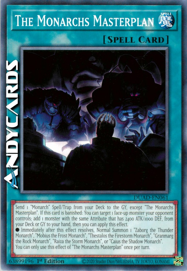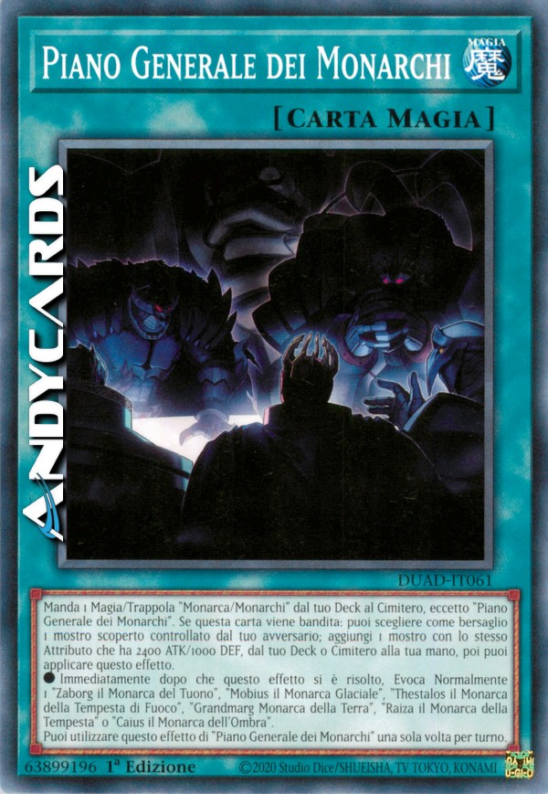 Manda 1 Magia/Trappola "Monarca/Monarchi" dal tuo Deck al Cimitero, eccetto "Piano Generale dei Monarchi". Se questa carta viene bandita: puoi scegliere come bersaglio 1 mostro scoperto controllato dal tuo avversario; aggiungi 1 mostro con lo stesso Attributo che ha 2400 ATK/1000 DEF, dal tuo Deck o Cimitero alla tua mano, poi puoi applicare questo effetto.
