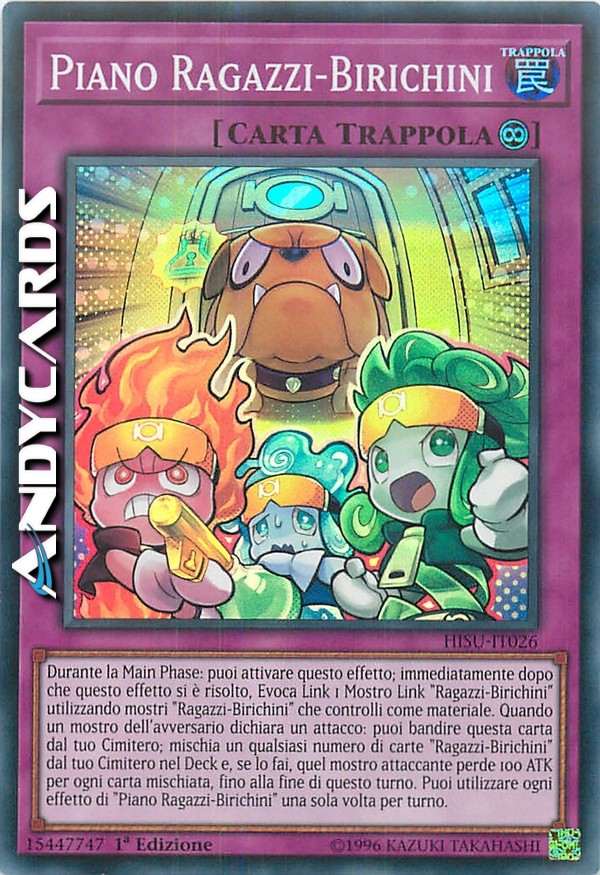 Durante la Main Phase: puoi attivare questo effetto; immediatamente dopo che questo effetto si è risolto, Evoca Link 1 Mostro Link "Ragazzi-Birichini" utilizzando mostri "Ragazzi-Birichini" che controlli come materiale. Quando un mostro dell'avversario dichiara un attacco: puoi bandire questa carta dal tuo Cimitero; mischia un qualsiasi numero di carte "Ragazzi-Birichini" dal tuo Cimitero nel Deck e, se lo fai, quel mostro attaccante perde 100 ATK per ogni carta mischiata, fino alla fine di questo turno. Puoi utilizzare ogni effetto di "Piano Ragazzi-Birichini" una sola volta per turno.