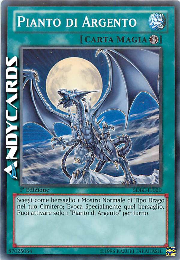 Scegli come bersaglio 1 Mostro Normale Drago nel tuo Cimitero; Evoca Specialmente quel bersaglio. Puoi attivare solo 1 "Pianto di Argento" per turno.