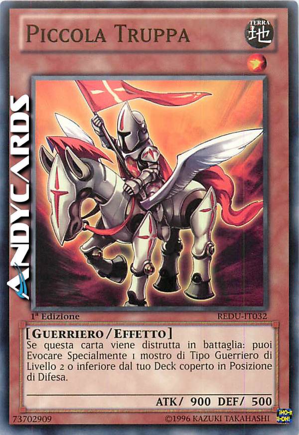 Se questa carta viene distrutta in battaglia: puoi Evocare Specialmente 1 mostro di Tipo Guerriero di Livello 2 o inferiore dal tuo Deck coperto in Posizione di Difesa.