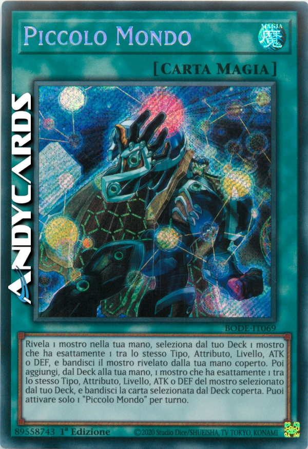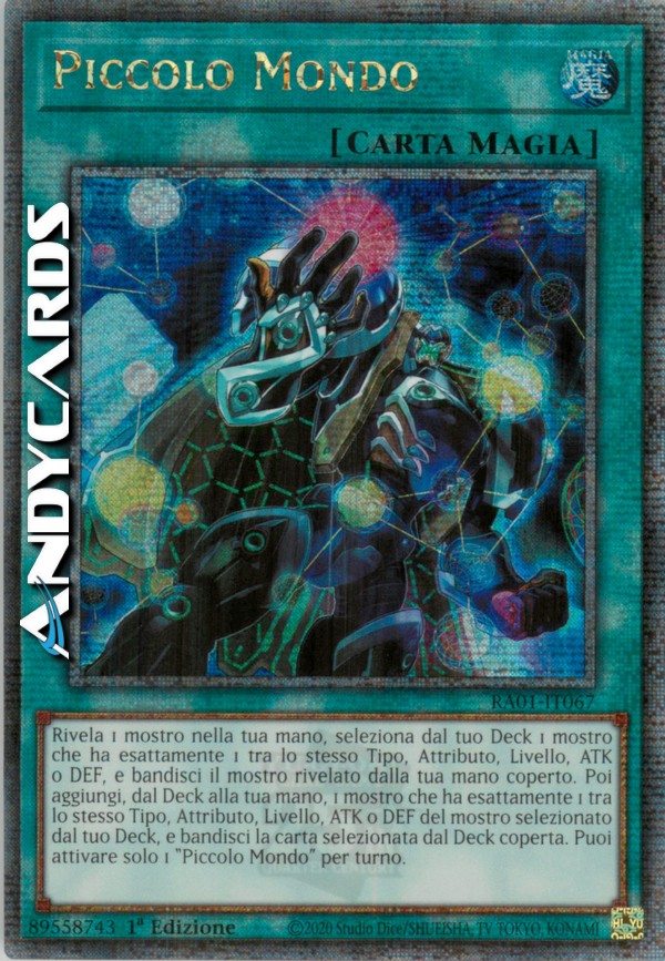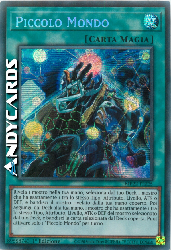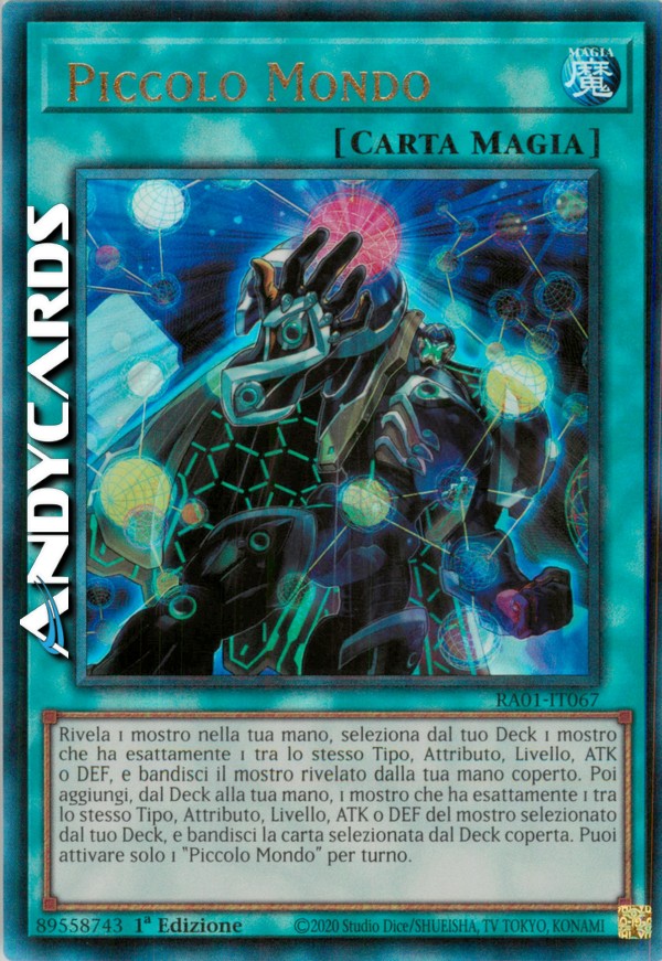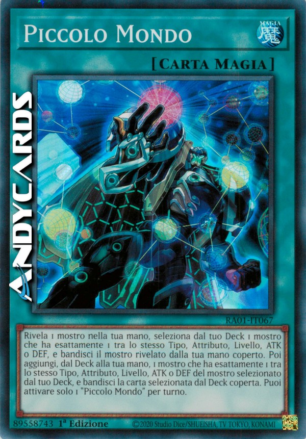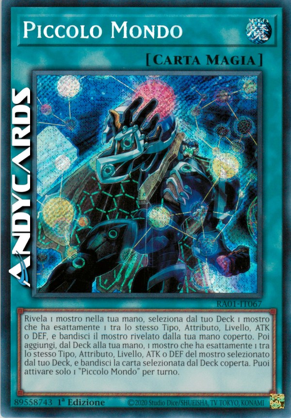 Rivela 1 mostro nella tua mano, seleziona dal tuo Deck 1 mostro che ha esattamente 1 tra lo stesso Tipo, Attributo, Livello, ATK o DEF, e bandisci il mostro rivelato dalla tua mano coperto. Poi aggiungi, dal Deck alla tua mano, 1 mostro che ha esattamente 1 tra lo stesso Tipo, Attributo, Livello, ATK o DEF del mostro selezionato dal tuo Deck, e bandisci la carta selezionata dal Deck coperta. Puoi attivare solo 1 "Piccolo Mondo" per turno.
