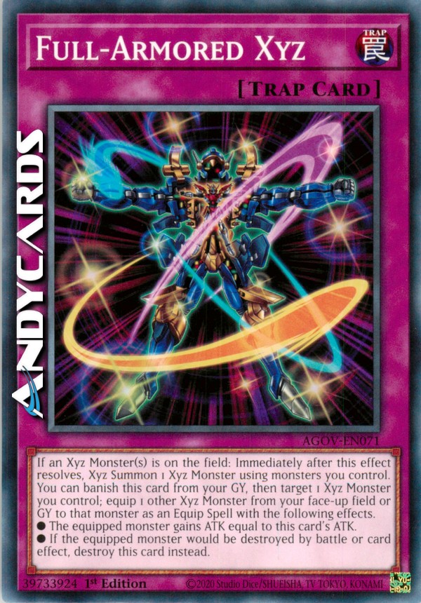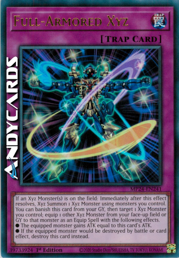 Se uno o più Mostri Xyz sono sul Terreno: immediatamente dopo che questo effetto si è risolto, Evoca Xyz 1 Mostro Xyz utilizzando mostri che controlli. Puoi bandire questa carta dal tuo Cimitero, poi scegliere come bersaglio 1 Mostro Xyz che controlli; equipaggia 1 altro Mostro Xyz dal tuo Terreno scoperto o Cimitero a quel mostro come una Magia Equipaggiamento con i seguenti effetti.