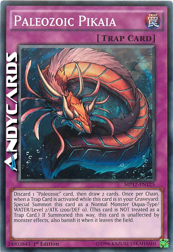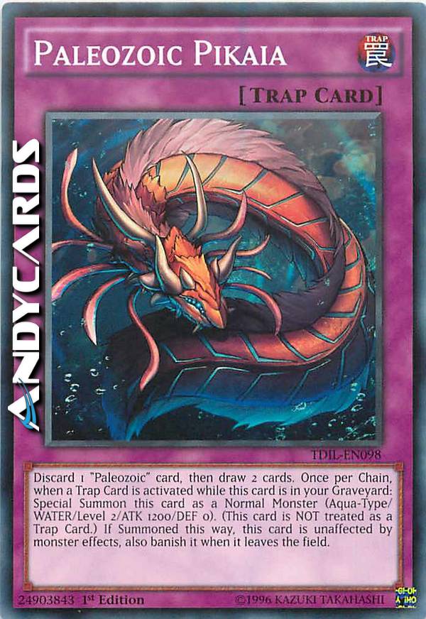 Discard 1 "Paleozoic" card, then draw 2 cards. Once per Chain, when a Trap Card isactivated while this card is in your Graveyard: Special Summon this card as a Normal Monster (Aqua/WATER/Level 2/ATK 1200/DEF 0). (This card is NOT treated as a Trap Card.) If Summoned this way, this card is unaffected by monster effects, alsobanish it when it leaves the field.