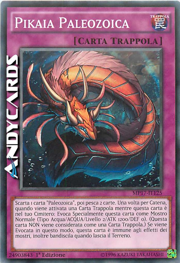 Scarta 1 carta "Paleozoica", poi pesca 2 carte. Una volta per Catena, quando viene attivata una Carta Trappola mentre questa carta è nel tuo Cimitero: Evoca Specialmente questa carta come Mostro Normale (Tipo Acqua/ACQUA/Livello 2/ATK 1200/DEF 0). (Questa carta NON viene considerata come una Carta Trappola.) Se viene Evocata in questo modo, questa carta è immune agli effetti dei mostri, inoltre bandiscila quando lascia il Terreno.
