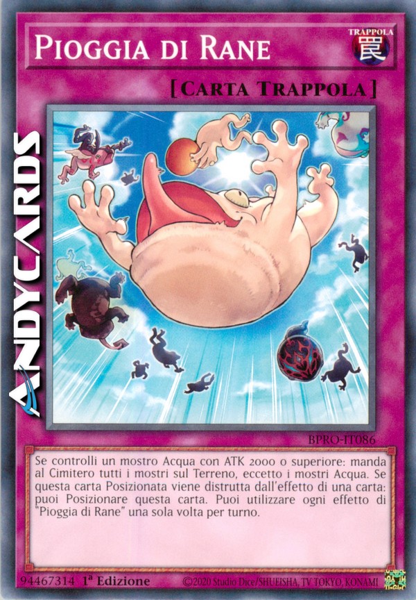 Se controlli un mostro Acqua con ATK 2000 o superiore: manda al Cimitero tutti i mostri sul Terreno, eccetto i mostri Acqua. Se questa carta Posizionata viene distrutta dall'effetto di una carta: puoi Posizionare questa carta. Puoi utilizzare ogni effetto di "Pioggia di Rane" una sola volta per turno.