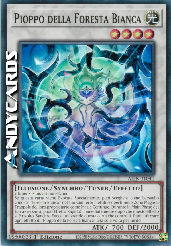 Se questa carta viene Evocata Specialmente: puoi scegliere come bersaglio 2 mostri "Foresta Bianca" nel tuo Cimitero; mettili scoperti nelle Zone Magie & Trappole del loro proprietario come Magie Continue. Durante la Main Phase del tuo avversario, puoi (Effetto Rapido): immediatamente dopo che questo effetto si è risolto, Synchro Evoca utilizzando questa carta che controlli. Puoi utilizzare ogni effetto di "Pioppo della Foresta Bianca" una sola volta per turno.
