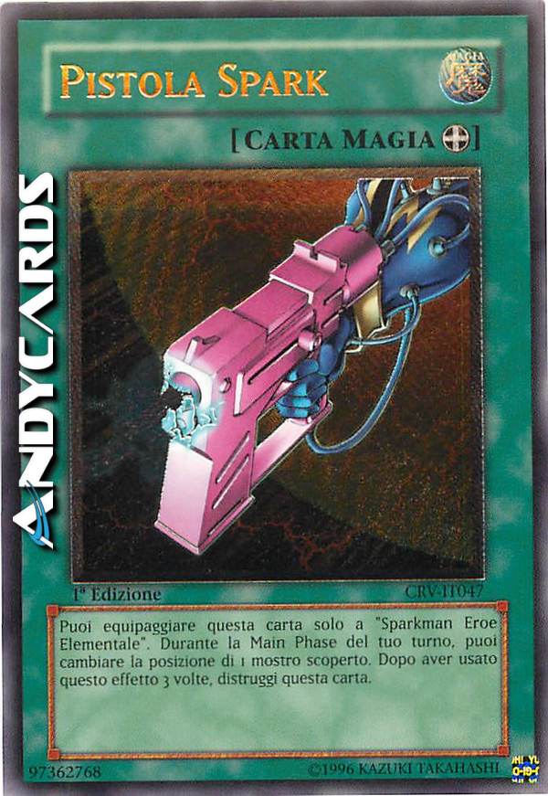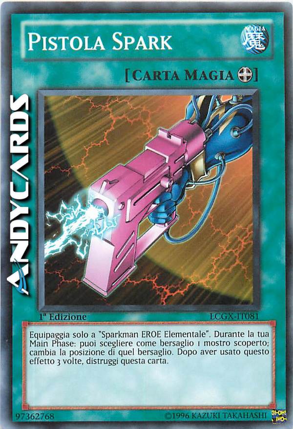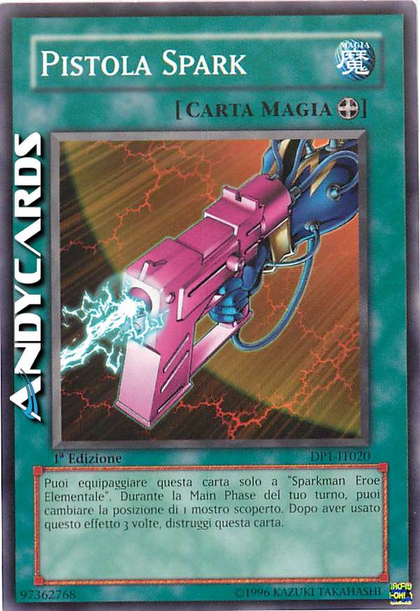 Puoi equipaggiare questa carta solo a Sparkman Eroe Elementale .Durante la Main Phase del tuo turno ,puoi cambiare la posizione di 1 mostro scoperto.Dopo aver usato questo effetto 3 volte, distruggi questa carta.