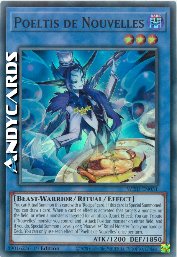 Puoi Evocare tramite Rituale questa carta con una carta "Ricetta". Se questa carta viene Evocata Specialmente: puoi pescare 1 carta. Quando viene attivata una carta o un effetto che sceglie come bersaglio un mostro sul Terreno, o quando un mostro viene scelto come bersaglio per un attacco (Effetto Rapido): puoi offrire come Tributo 1 mostro "Nouvelles" che controlli e 1 mostro in Posizione di Attacco su qualsiasi Terreno e, se lo fai, Evoca Specialmente 1 Mostro Rituale "Nouvelles" di Livello 4 o 5 dalla tua mano o Deck. Puoi utilizzare ogni effetto di "Poeltis de Nouvelles" una sola volta per turno.