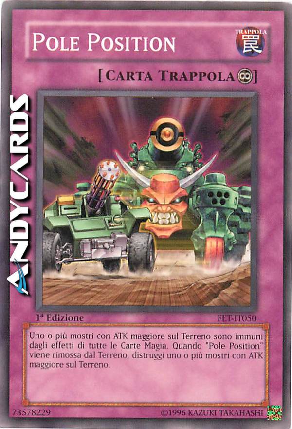 Uno o più mostri con ATK maggiore sul Terreno sono immuni dagli effetti di tutte le Carte Magia. Quando "Pole Position" viene rimossa dal Terreno, distruggi uno o più mostri con ATK maggiore sul Terreno.
