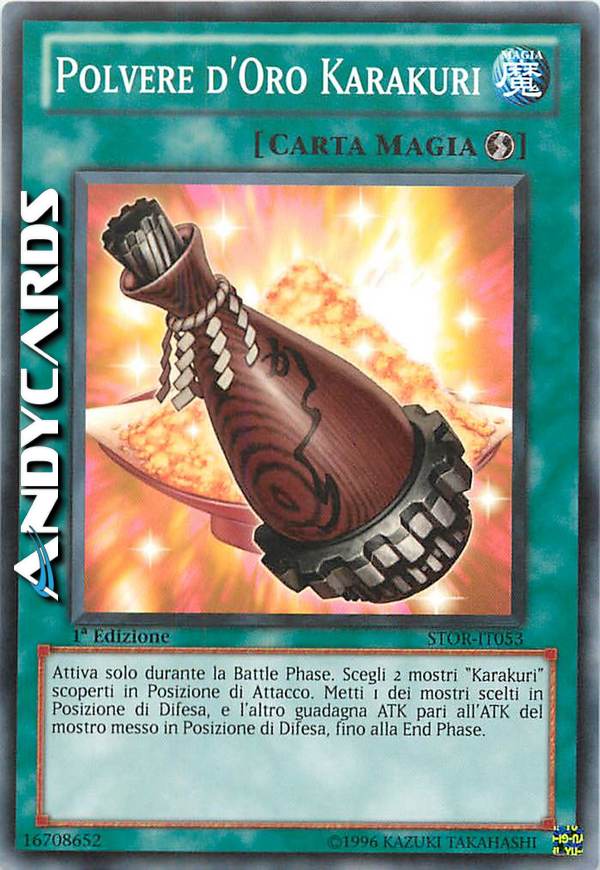 Attiva solo durante la Battle Phase. Scegli 2 mostri "Karakuri" scoperti in Posizione di Attacco. Metti 1 dei mostri scelti in Posizione di Difesa, e l'altro guadagna ATK pari all'ATK del mostro messo in Posizione di Difesa, fino alla End Phase.