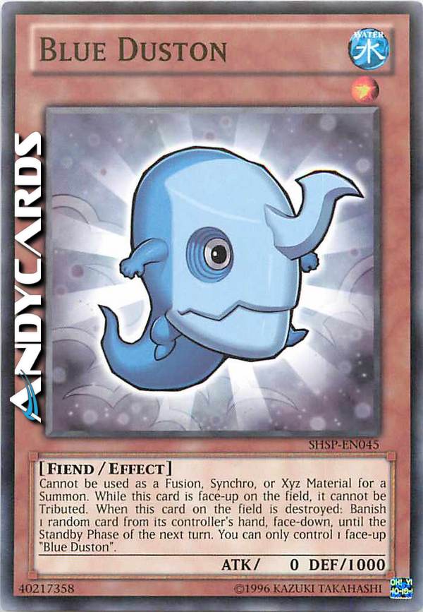 Cannot be used as a Fusion, Synchro, or Xyz Material for a Summon. While this card is face-up on the field, it cannot be Tributed. When this card on the field is destroyed: Banish 1 random card from the controller's hand, face-down, until the next turn's Standby Phase. You can only control 1 face-up "Blue Duston".
