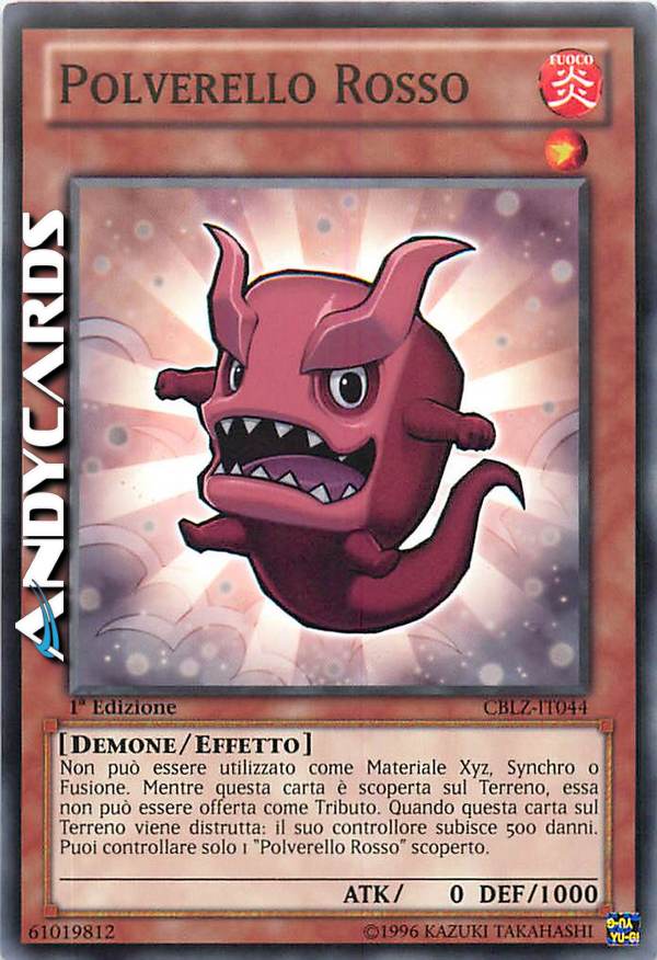 Non può essere utilizzato come Materiale Xyz, Synchro o Fusione. Mentre questa carta è scoperta sul Terreno, essa non può essere offerta come Tributo. Quando questa carta sul Terreno viene distrutta: il suo controllore subisce 500 danni. Puoi controllare solo 1 "Polverello Rosso" scoperto.