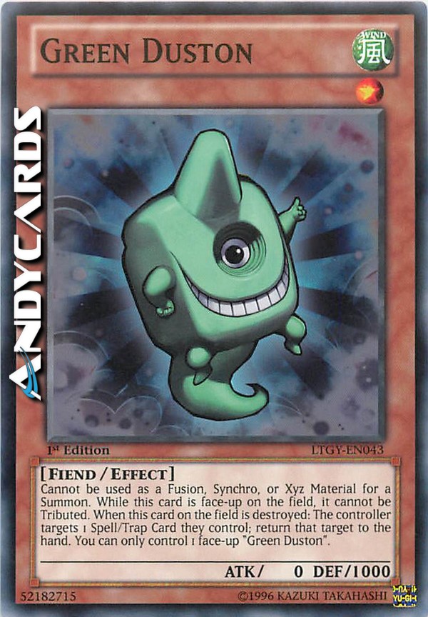 Cannot be used as a Fusion, Synchro, or Xyz Material for a Summon. While this card is face-up on the field, it cannot be Tributed. When this card on the field is destroyed: The controller targets 1 Spell/Trap Card they control; return that target to the hand. You can only control 1 face-up "Green Duston".