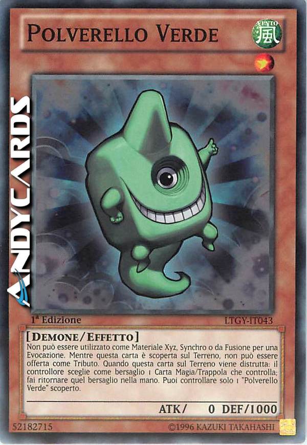 Non può essere utilizzato come Materiale Xyz, Synchro o da Fusione per un Evocazione. Mentre questa carta è scoperta sul Terreno, non può essere offerta come Tributo. Quando questa carta sul Terreno viene distrutta: il controllore scegliere come bersaglio 1 Carta Magia/Trappola che controlla; fai tornare quel bersaglio nella mano. Puoi controllare solo 1 "Polverello Verde" scoperto.