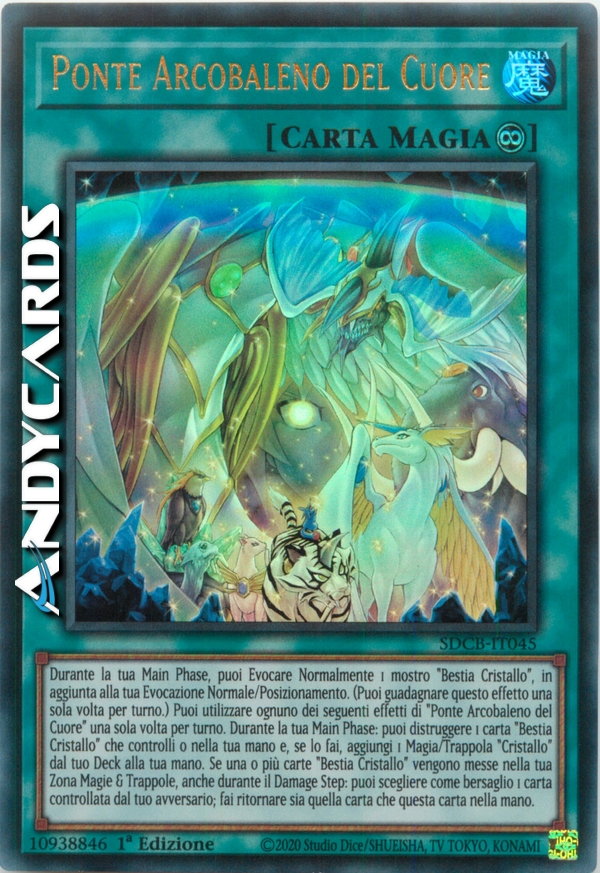 Durante la tua Main Phase, puoi Evocare Normalmente 1 mostro "Bestia Cristallo", in aggiunta alla tua Evocazione Normale/Posizionamento. (Puoi guadagnare questo effetto una sola volta per turno.) Puoi utilizzare ognuno dei seguenti effetti di "Ponte Arcobaleno del Cuore" una sola volta per turno. Durante la tua Main Phase: puoi distruggere 1 carta "Bestia Cristallo" che controlli o nella tua mano e, se lo fai, aggiungi 1 Magia/Trappola "Cristallo" dal tuo Deck alla tua mano. Se una o più carte "Bestia Cristallo" vengono messe nella tua Zona Magie & Trappole, anche durante il Damage Step: puoi scegliere come bersaglio 1 carta controllata dal tuo avversario; fai ritornare sia quella carta che questa carta nella mano.