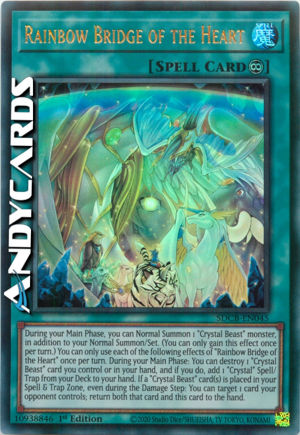 During your Main Phase, you can Normal Summon 1 "Crystal Beast" monster, in addition to your Normal Summon/Set. (You can only gain this effect once per turn.) You can only use each of the following effects of "Rainbow Bridge of the Heart" once per turn. During your Main Phase: You can destroy 1 "Crystal Beast" card you control or in your hand, and if you do, add 1 "Crystal" Spell/Trap from your Deck to your hand. If a "Crystal Beast" card(s) is placed in your Spell & Trap Zone, even during the Damage Step: You can target 1 card your opponent controls; return both that card and this card to the hand.