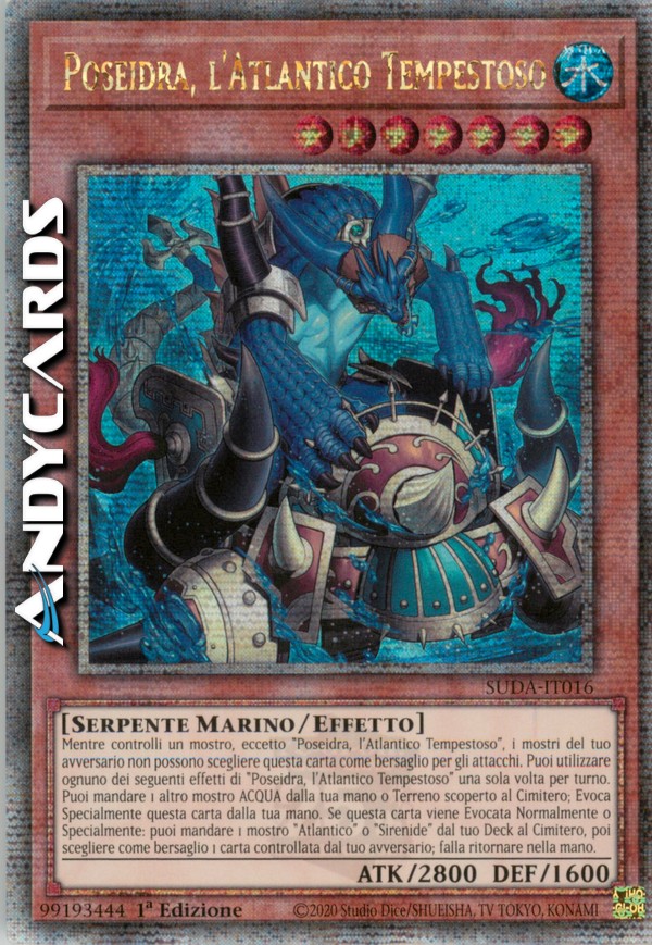 Mentre controlli un mostro, eccetto "Poseidra, l'Atlantico Tempestoso", i mostri del tuo avversario non possono scegliere questa carta come bersaglio per gli attacchi. Puoi utilizzare ognuno dei seguenti effetti di "Poseidra, l'Atlantico Tempestoso" una sola volta per turno. Puoi mandare 1 altro mostro ACQUA dalla tua mano o Terreno scoperto al Cimitero; Evoca Specialmente questa carta dalla tua mano. Se questa carta viene Evocata Normalmente o Specialmente: puoi mandare 1 mostro "Atlantico" o "Sirenide" dal tuo Deck al Cimitero, poi scegliere come bersaglio 1 carta controllata dal tuo avversario; falla ritornare nella mano.