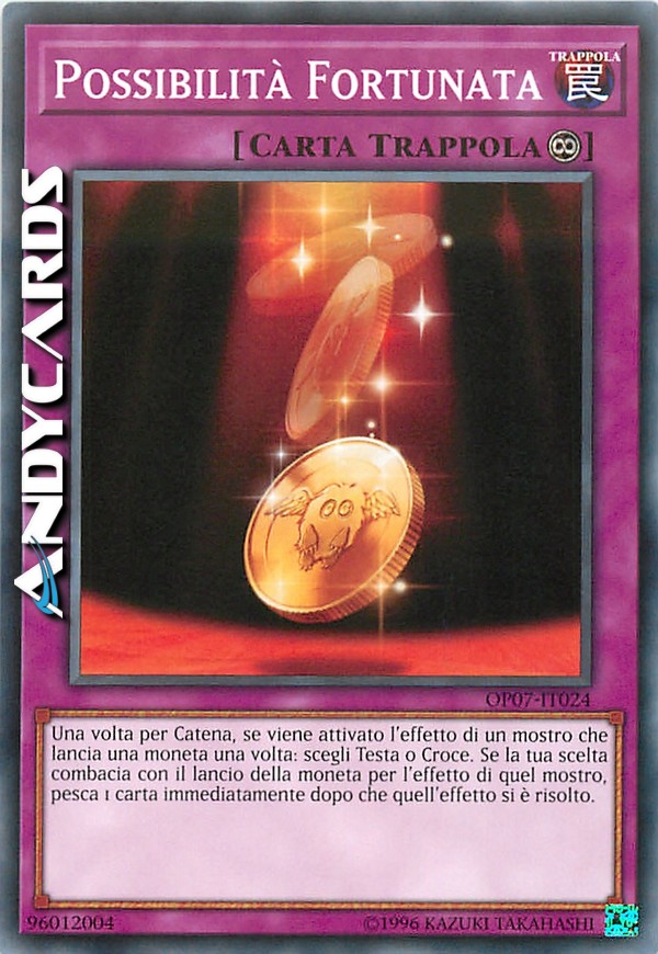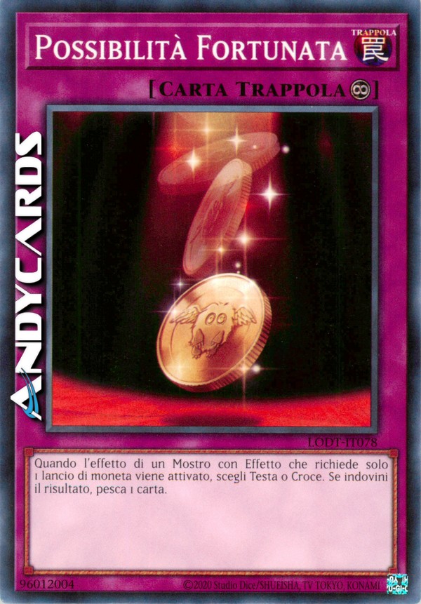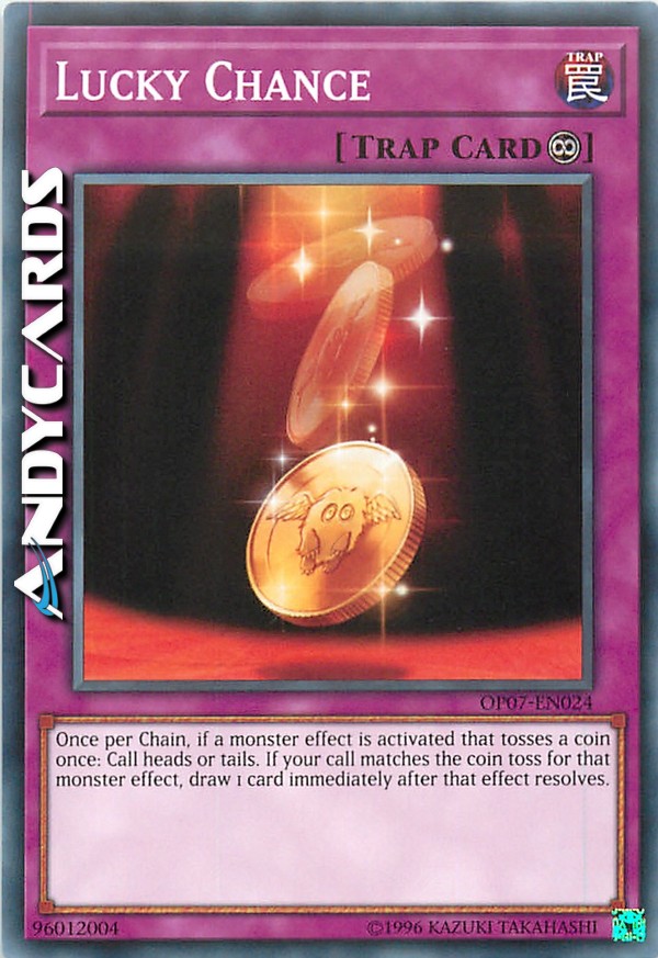 Una volta per Catena, se viene attivato l'effetto di un mostro che lancia una moneta una volta: scegli Testa o Croce. Se la tua scelta combacia con il lancio della moneta per l'effetto di quel mostro, pesca 1 carta immediatamente dopo che quell'effetto si è risolto.