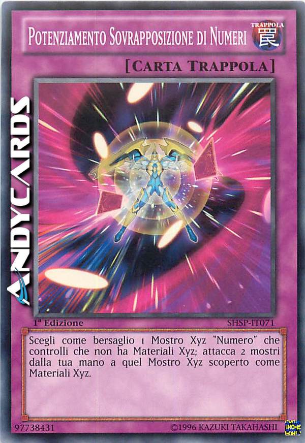 Scegli come bersaggio 1 Mostro Xyz "Numero" che controlli che non ha Materiali Xyz; attacca 2 mostri dalla tua mano a quel Mostro Xyz scoperto come Materiali Xyz.