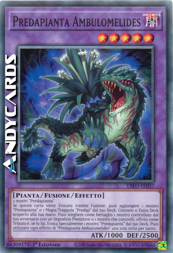 Se questa carta viene Evocata tramite Fusione: puoi aggiungere 1 mostro "Predapianta" o 1 Magia/Trappola "Predap" dal tuo Deck, Cimitero o Extra Deck scoperto alla tua mano. Puoi scegliere come bersaglio 1 mostro controllato dal tuo avversario con un Segnalino Predatore o 1 mostro che controlli; offrilo come Tributo e, se lo fai, Evoca Specialmente 1 mostro "Predapianta" dal tuo Deck. Puoi utilizzare ogni effetto di "Predapianta Ambulomelides" una sola volta per turno.