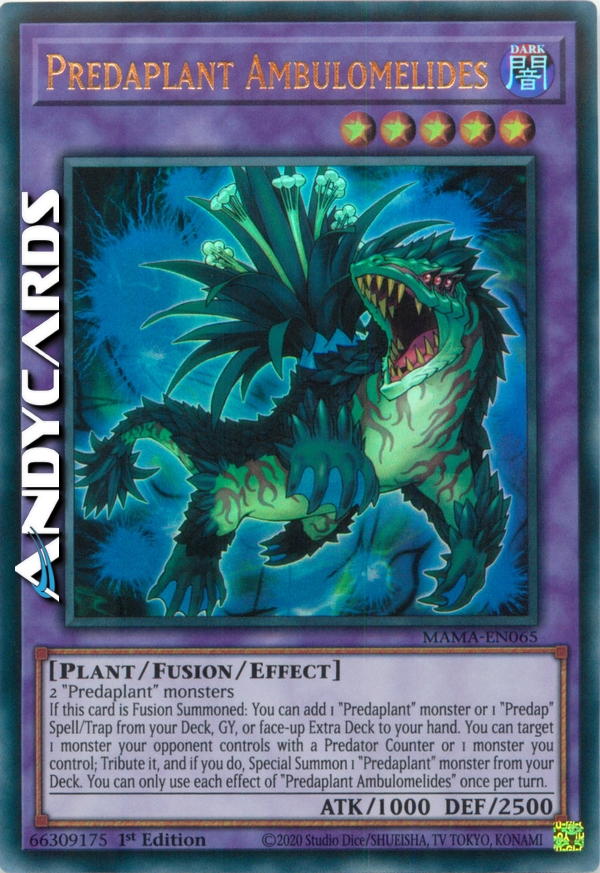 If this card is Fusion Summoned: You can add 1 "Predaplant" monster or 1 "Predap" Spell/Trap from your Deck, GY, or face-up Extra Deck to your hand. You can target 1 monster your opponent controls with a Predator Counter or 1 monster you control; Tribute it, and if you do, Special Summon 1 "Predaplant" monster from your Deck. You can only use each effect of "Predaplant Ambulomelides" once per turn.
