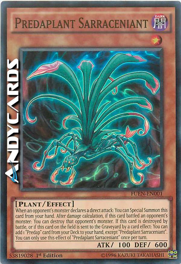 Quando un mostro dell'avversario dichiara un attacco diretto: puoi Evocare Specialmente questa carta dalla tua mano. Dopo il calcolo dei danni, se questa carta ha combattuto con un mostro dell'avversario: puoi distruggere quel mostro dell'avversario. Se questa carta viene distrutta in battaglia, o se questa carta sul Terreno viene mandata al Cimitero dall'effetto di una carta: puoi aggiungere 1 carta "Predap" dal tuo Deck alla tua mano, eccetto "Predapianta Sarraceniaformica". Puoi utilizzare questo effetto di "Predapianta Sarraceniaformica" una sola volta per turno.