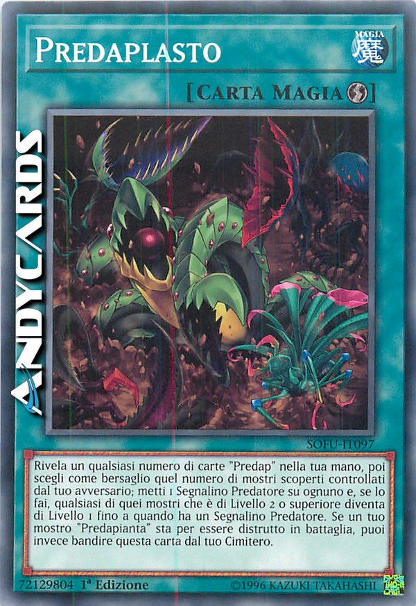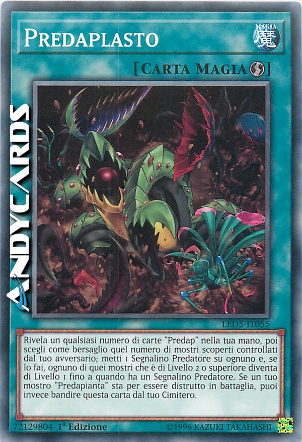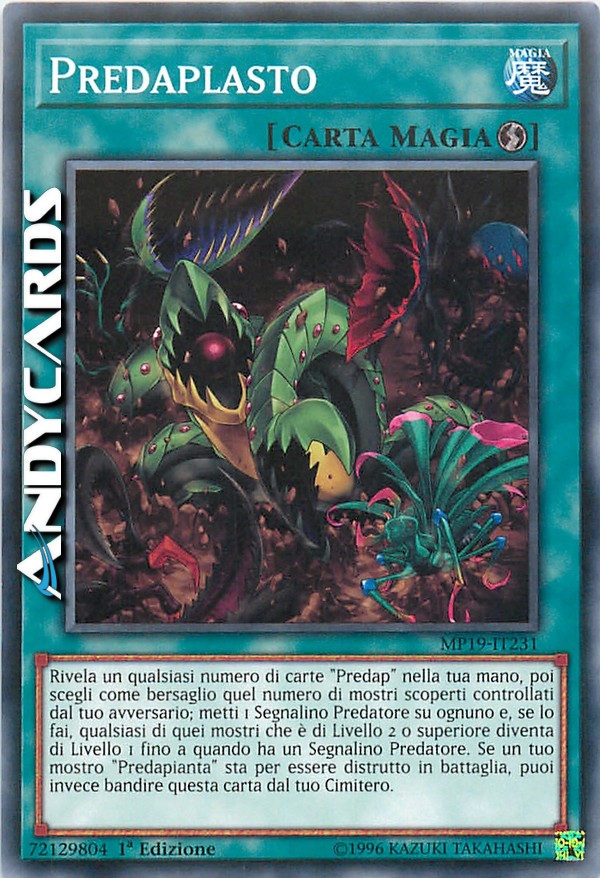 Rivela un qualsiasi numero di carte "Predap" nella tua mano, poi scegli come bersaglio quel numero di mostri scoperti controllati dal tuo avversario; metti 1 Segnalino Predatore su ognuno e, se lo fai, ognuno di quei mostri che è di Livello 2 o superiore diventa di Livello 1 fino a quando ha un Segnalino Predatore. Se un tuo mostro "Predapianta" sta per essere distrutto in battaglia, puoi invece bandire questa carta dal tuo Cimitero.
