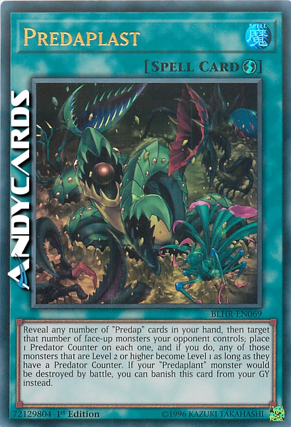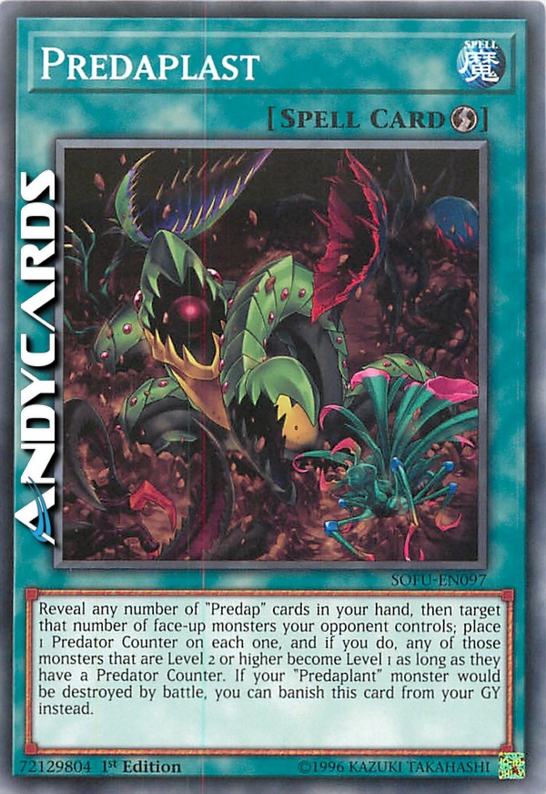 Reveal any number of "Predap" cards in your hand, then target that number of face-up monsters your opponent controls; place 1 Predator Counter on each one, and if you do, any of those monsters that are Level 2 or higher become Level 1 as long as they have a Predator Counter. If your "Predaplant" monster would be destroyed by battle, you can banish this card from your GY instead.