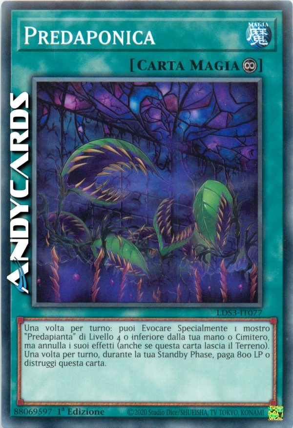 Una volta per turno: puoi Evocare Specialmente 1 mostro "Predapianta" di Livello 4 o inferiore dalla tua mano o Cimitero, ma i suoi effetti si annullano (anche se questa carta lascia il Terreno). Una volta per turno, durante la tua Standby Phase, paga 800 LP o distruggi questa carta.