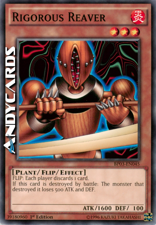 Flip: Each player discards 1 card. A monster that destroys this card by battle loses 500 ATK and DEF.
