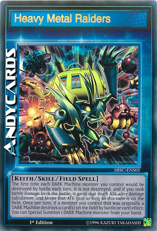 The first time each DARK Machine monster you control would be destroyed by battle each turn, it is not destroyed, and if you took battle damage from the battle, it gains that much ATK after damage calculation, and keeps that ATK gain as long as this card is on the field. Once per turn, if a monster you control that was originally a DARK Machine destroys a card(s) on the field by battle or card effect: You can Special Summon 1 DARK Machine monster from your hand.