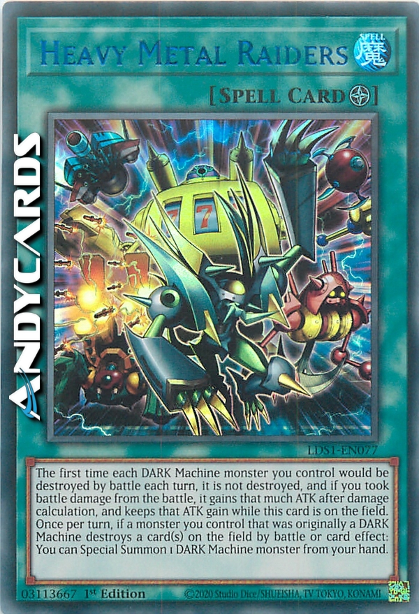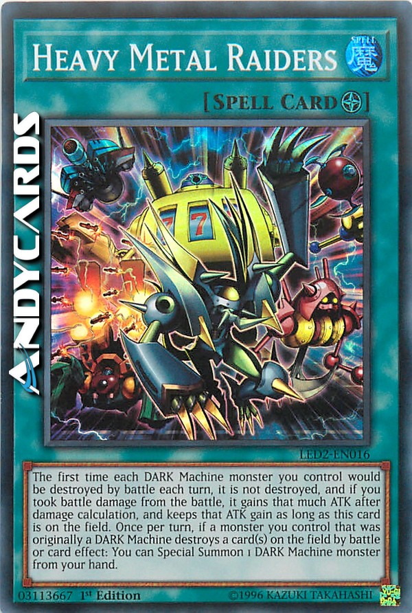 The first time each DARK Machine monster you control would be destroyed by battle each turn, it is not destroyed, and if you took battle damage from the battle, it gains that much ATK after damage calculation, and keeps that ATK gain as long as this card is on the field. Once per turn, if a monster you control that was originally a DARK Machine destroys a card(s) on the field by battle or card effect: You can Special Summon 1 DARK Machine monster from your hand.