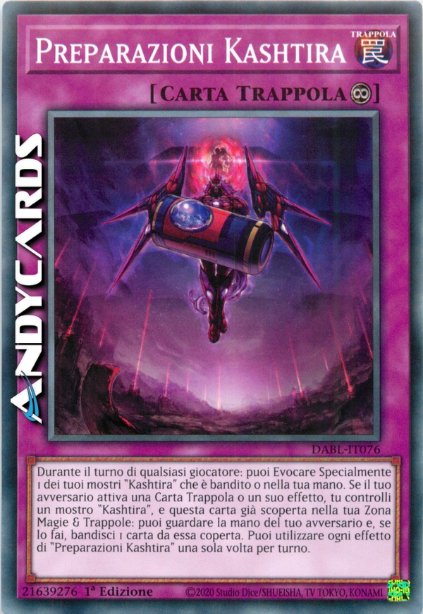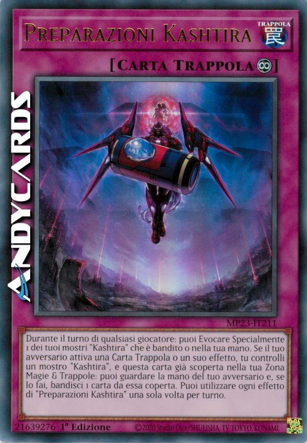 Durante il turno di qualsiasi giocatore: puoi Evocare Specialmente 1 dei tuoi mostri "Kashtira" che è bandito o nella tua mano. Se il tuo avversario attiva una Carta Trappola o un suo effetto, tu controlli un mostro "Kashtira", e questa carta già scoperta nella tua Zona Magie & Trappole: puoi guardare la mano del tuo avversario e, se lo fai, bandisci 1 carta da essa coperta. Puoi utilizzare ogni effetto di "Preparazioni Kashtira" una sola volta per turno.