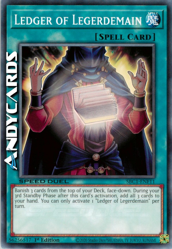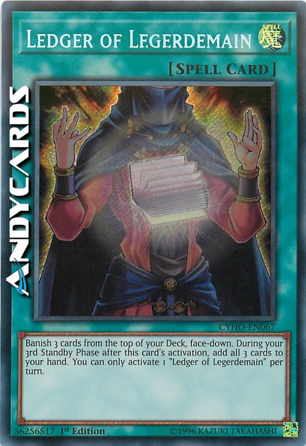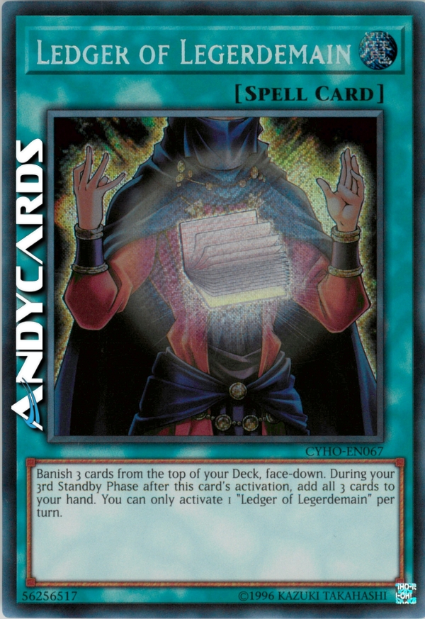 Banish 3 cards from the top of your Deck, face-down. During your 3rd Standby Phase after this card's activation, add all 3 cards to your hand. You can only activate 1 "Ledger of Legerdemain" per turn.