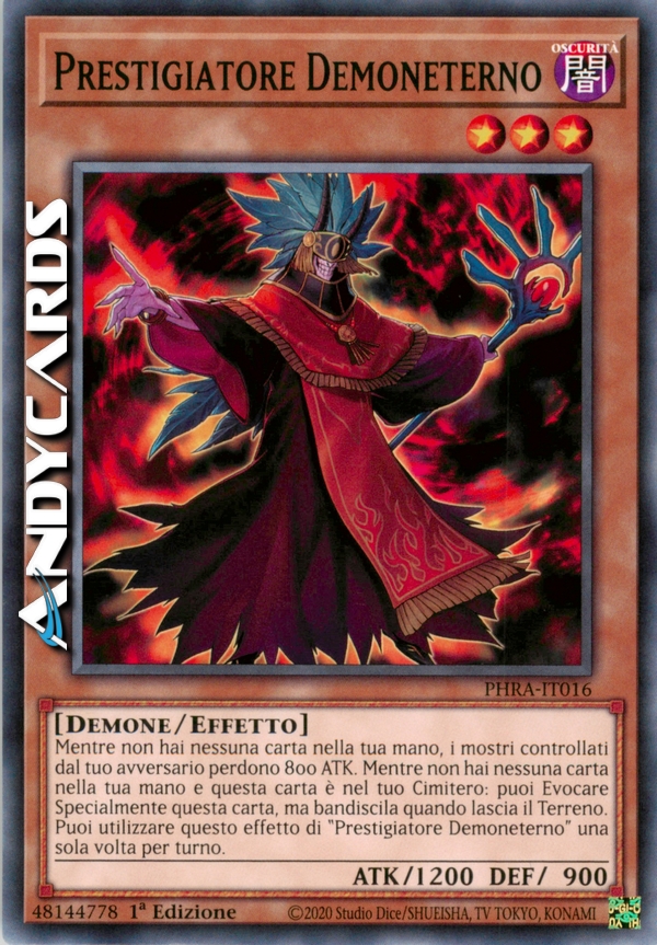 Mentre non hai nessuna carta nella tua mano, i mostri controllati dal tuo avversario perdono 800 ATK. Mentre non hai nessuna carta nella tua mano e questa carta è nel tuo Cimitero: puoi Evocare Specialmente questa carta, ma bandiscila quando lascia il Terreno. Puoi utilizzare questo effetto di "Prestigiatore Demoneterno" una sola volta per turno.