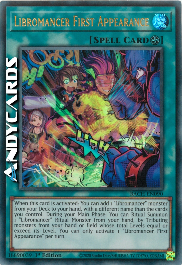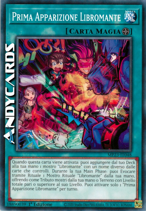 Quando questa carta viene attivata: puoi aggiungere dal tuo Deck alla tua mano 1 mostro "Libromante" con un nome diverso dalle carte che controlli. Durante la tua Main Phase: puoi Evocare tramite Rituale 1 Mostro Rituale "Libromante" dalla tua mano, offrendo come Tributo mostri dalla tua mano o Terreno con Livello totale pari o superiore al suo Livello. Puoi attivare solo 1 "Prima Apparizione Libromante" per turno.