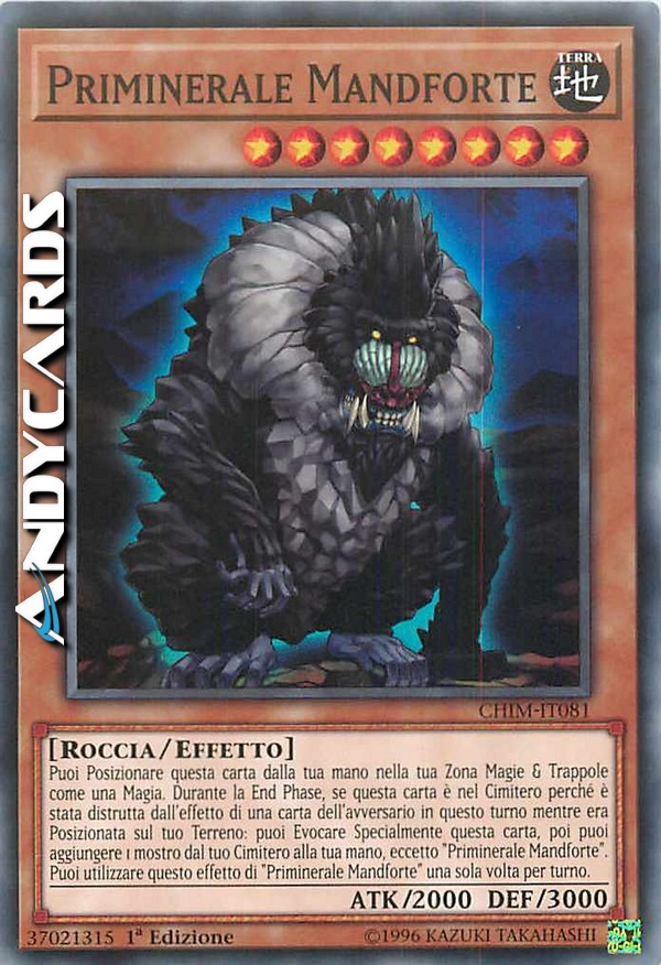 Puoi Posizionare questa carta dalla tua mano nella tua Zona Magie & Trappole come una Magia. Durante la End Phase, se questa carta è nel Cimitero perché è stata distrutta dall'effetto di una carta dell'avversario in questo turno mentre era Posizionata sul tuo Terreno: puoi Evocare Specialmente questa carta, poi puoi aggiungere 1 mostro dal tuo Cimitero alla tua mano, eccetto "Priminerale Mandforte". Puoi utilizzare questo effetto di "Priminerale Mandforte" una sola volta per turno.