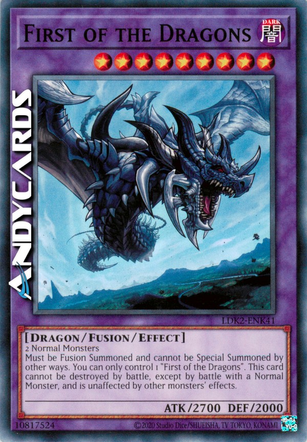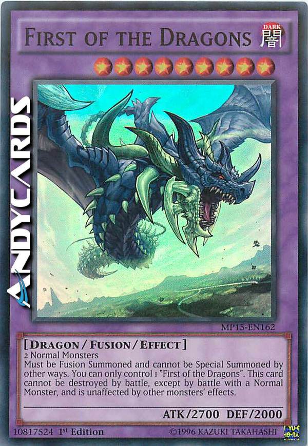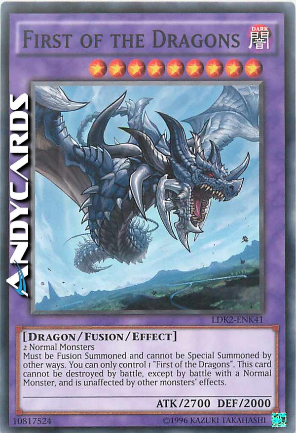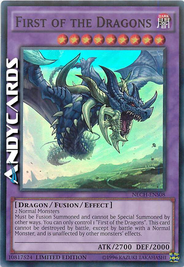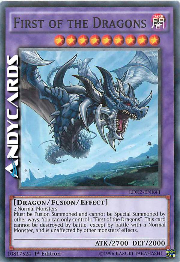 Must be Fusion Summoned and cannot be Special Summoned by other ways. You can only control 1 "First of the Dragons". This card cannot be destroyed by battle, except by battle with a Normal Monster, and is unaffected by other monsters' effects.