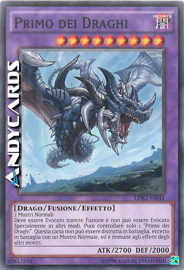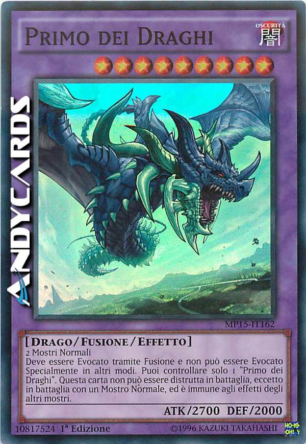 Deve essere Evocato tramite Fusione e non può essere Evocato Specialmente in altri modi. Puoi controllare solo 1 "Primo dei Draghi". Questa carta non può essere distrutta in battaglia, eccetto in battaglia con un Mostro Normale, ed è immune agli effetti degli altri mostri.