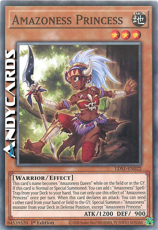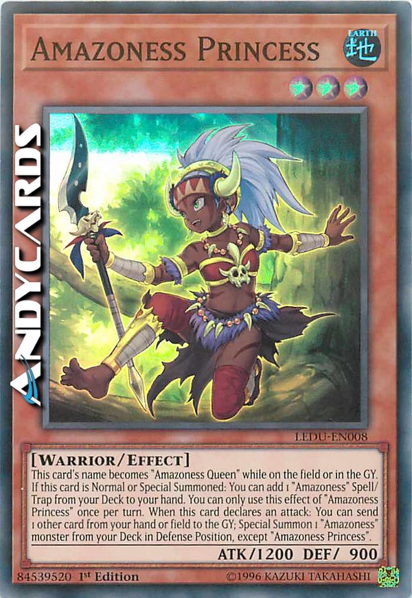 Il nome di questa carta diventa "Regina Amazoness" mentre è sul Terreno o nel Cimitero. Se questa carta viene Evocata Normalmente o Specialmente: puoi aggiungere 1 Magia/Trappola "Amazoness" dal tuo Deck alla tua mano. Puoi utilizzare questo effetto di "Principessa Amazoness" una sola volta per turno. Quando questa carta dichiara un attacco: puoi mandare 1 altra carta dalla tua mano o Terreno al Cimitero; Evoca Specialmente 1 mostro "Amazoness" dal tuo Deck in Posizione di Difesa, eccetto "Principessa Amazoness".